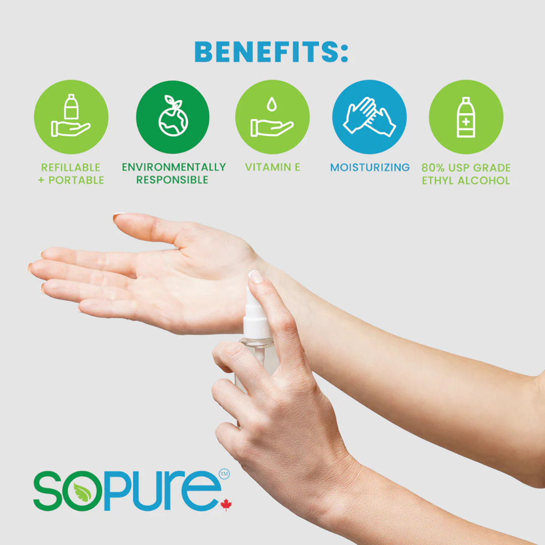SoPure Hand Sanitizers are 99% natural, made with vegetable-based ingredients. Vitamin E and our own moisturizing blend. It is strong enough to kill germs and viruses after 15-30 seconds, yet gentle enough for continued use. Made from 99% natural vegetable-based ingredients. No harmful chemicals, No triclosan. Safe to use by children 2+. Ingredients used: denaturated alcohol, water, natural glycerol, isopropyl alcohol. emollients (may contain tocopherol (Vitamin E), Aloe barbadensis), DC&F colour additive, fragrance.