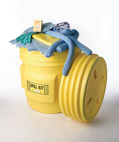 Oil-Only kit. Includes 50 - 15"x18" heavy weight pads, 2 - 5"x10' oil only booms, 9 - 3"x10' socks, 20 wipers, 1 pair of goggles, 1 pair of nitrile gloves, 10 temporary disposal bags, 1 emergency response guide, 1 - 65 gallon overpack with lid. Kits are packed in a D.O.T. and U.N. approved 65 gallon overpack container. Absorbs up to 40 gallons.